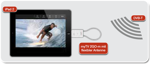 Mit myTV 2GO-m empfängst Du DVB-T* Fernsehen ganz einfach und ohne Internetverbindung an Deinem iPad2 oder iPhone4s.