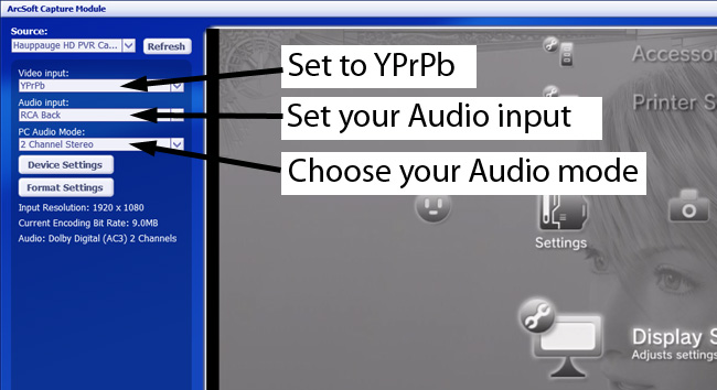 When you open the Arcsoft capture module, select YPrPb for you video input and either RCA back (if you selected audio input connector) or S/PDIF (if you chose digital optical) for your input audio.